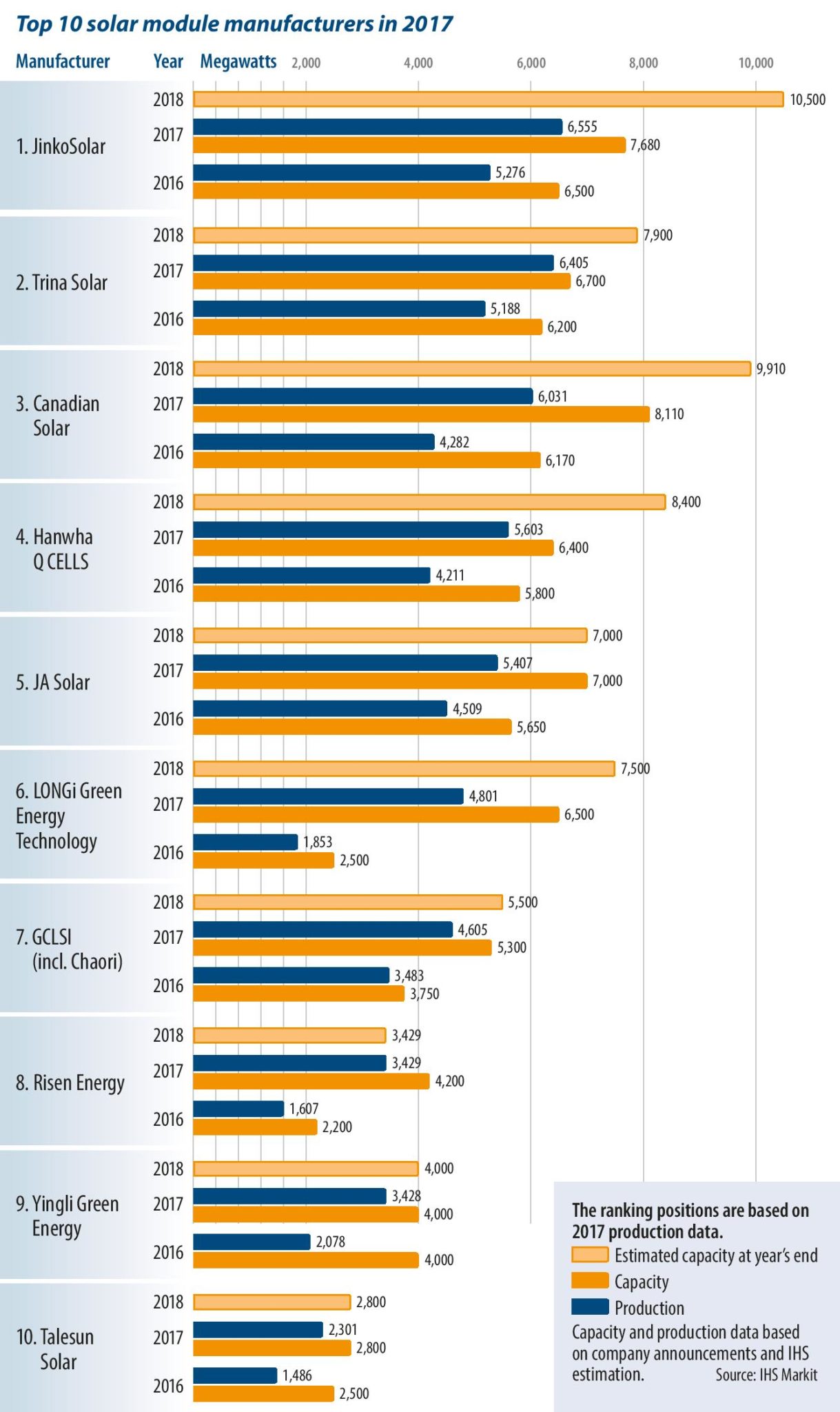 中國在供需方面都是主導(dǎo)者。 “2017年中國的全球市場份額約占53%。”IHS Markit高級分析師Karl Melkonyan表示。 “組件制造商還在繼續(xù)擴(kuò)產(chǎn),2017年帶來了近10 GW的額外容量。”
