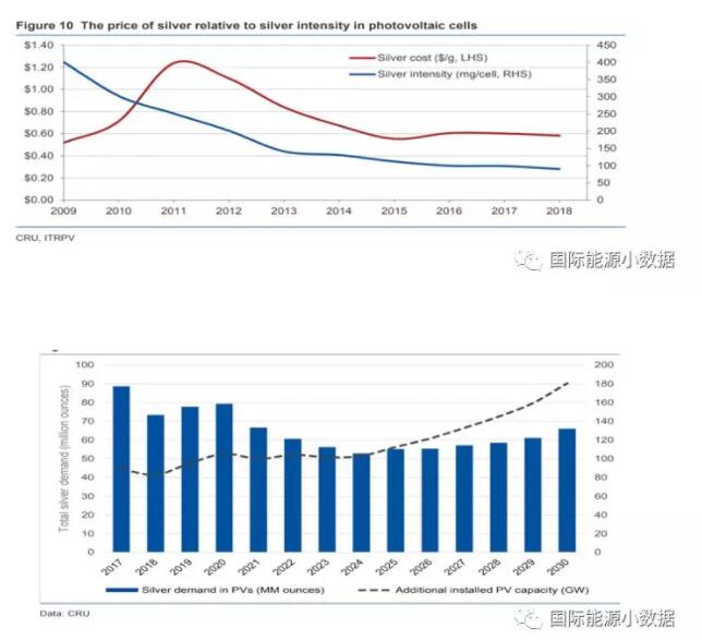 太陽(yáng)能電池正面和背面生產(chǎn)導(dǎo)電銀漿需要耗銀。根據(jù)國(guó)際白銀協(xié)會(huì)(The Silver Institute)最新發(fā)布的報(bào)告,2009年每片光伏電池含銀量為400毫克,到2016年已經(jīng)降至130毫克,預(yù)計(jì)到2028年左右光伏電池的含銀量下降一半,達(dá)到65毫克;而每片電池的產(chǎn)出從2018年的4.7瓦將增至2030年的6.0瓦,意味著每瓦光伏電池所需要的銀量將下降,從2017年的每瓦22毫克降至2030年的每瓦10.5毫克。