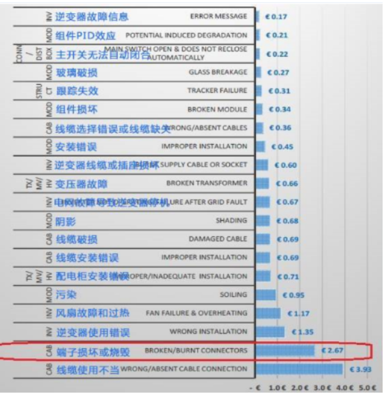 光伏連接器,又稱MC接頭,在光伏系統(tǒng)中,連接器占比很小,但很多環(huán)節(jié)都需要用到,比如接線盒、匯流箱、組件和逆變器之間的線纜連接都需要。很多施工人員對(duì)連接器認(rèn)識(shí)不足,由于連接器的問題引發(fā)電站故障可不少,2016年7月‘solarbankability’發(fā)布的另一份報(bào)告《影響光伏發(fā)電因素回顧和分析》報(bào)告中,在電站TOP20影響因素中,連接器損壞或燒毀造成的發(fā)電量損失排在第2位。