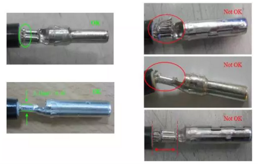 3、采用專業(yè)的剝線鉗和壓接鉗,不專業(yè)的工具造成壓接不良。比如部分銅絲剪斷,有些銅絲沒有壓接進(jìn)去,誤壓到絕緣層,壓接力量過小或者過大。