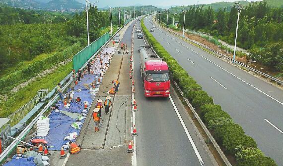 8月15日,記者驅(qū)車前往南繞城高速實(shí)地調(diào)查。這段約1公里長(zhǎng)的光伏路面原本鋪在一條行車道和應(yīng)急車道上,如今行車道的光伏面板大部分已被新鋪設(shè)的瀝青路面取代,應(yīng)急車道的光伏面板沒(méi)有拆除,但每隔幾米就有一處破損,最嚴(yán)重的當(dāng)數(shù)光伏面板的接縫處,出現(xiàn)了突起、鼓包,踩上去軟塌塌的。粗略統(tǒng)計(jì),該路段每分鐘就有三四輛大型車經(jīng)過(guò)。