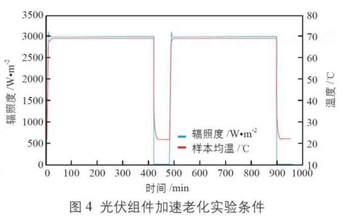 根據(jù)上述實驗結(jié)果,光伏組件在70 ℃恒溫和3000 W/m2 的輻照強度下,其衰減特性與戶外測試結(jié)果更為吻合,因此采用如圖4 所示的實驗條件:70 ℃恒溫、濕度保持在40%~80% 之間循環(huán)、 3000 W/m2 的輻照強度,開展光伏組件的加速老化模擬實驗。
