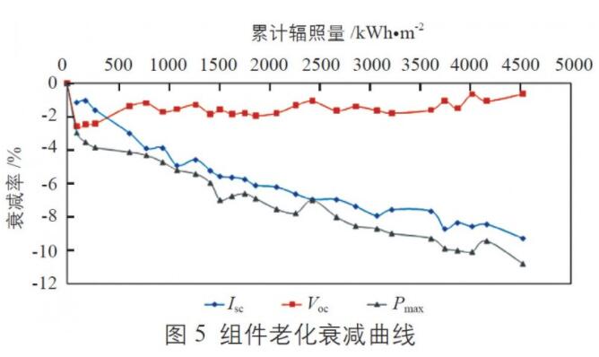 2)光伏組件的功率衰減與短路電流的衰減基本一致,而在后期衰減過程中開路電壓基本保持不變,這表明組件的后期老化衰減主要與材料的光學(xué)損失有關(guān)。