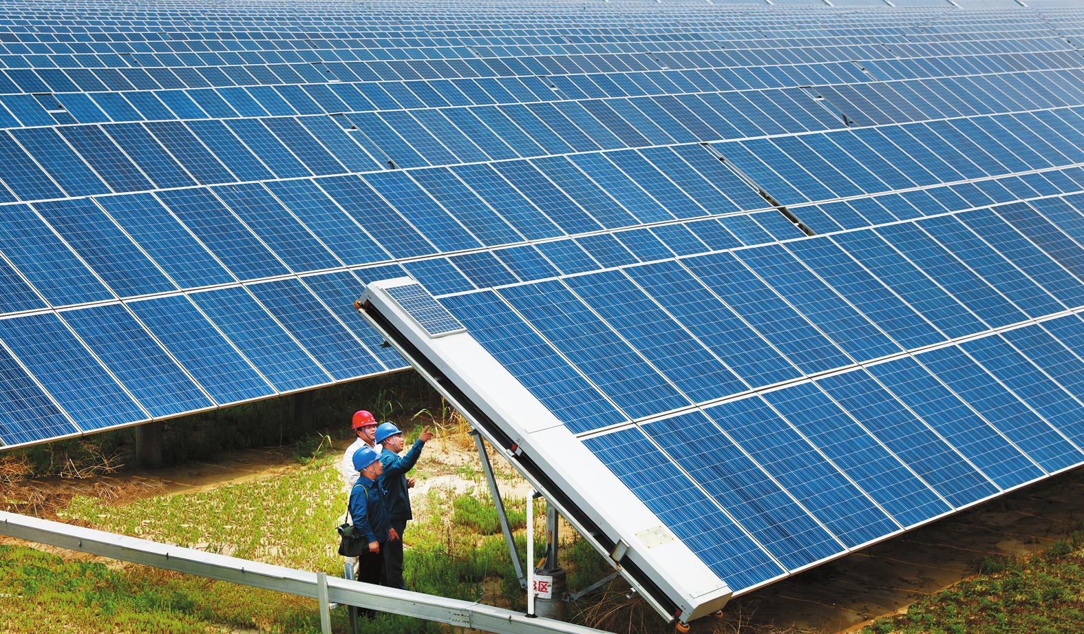 下圖:7月17日,國網(wǎng)山東壽光市供電公司員工來到山東萬海35兆瓦地面光伏電站提供上門服務(wù)。截至6月底,壽光境內(nèi)投運光伏發(fā)電項目合計戶數(shù)606戶,容量達(dá)到467.56兆瓦,年發(fā)電量約5.61億千瓦時。