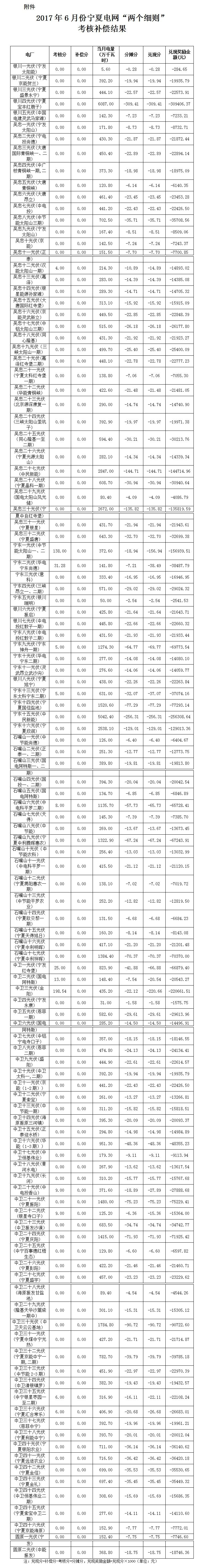 2017年6月份寧夏電網(wǎng)“兩個細則”考核補償情況(光伏)