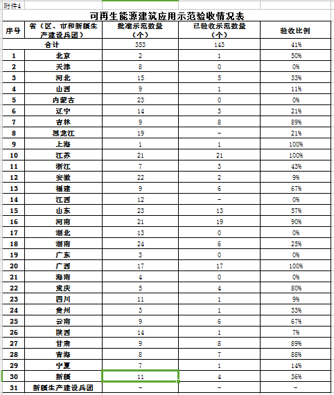 關于可再生能源建筑應用相關示范驗收。截至2016年底,全國各省(區(qū)、市和新疆生產(chǎn)建設兵團)已累計完成可再生能源建筑應用各類示范143個,占批準示范數(shù)量的41%。上海、江蘇、廣西已完成全部各類示范的驗收工作,吉林、河南、重慶、甘肅、青海已驗收數(shù)量超過批準示范數(shù)量的80%以上,江西、內(nèi)蒙古、湖北、廣東、海南、天津等地示范項目驗收進度滯后。