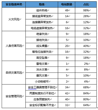 從50座典型電站的安全隱患統(tǒng)計表中可以看出,大多數(shù)光伏電站均存在不同程度的安全隱患,嚴重影響電站人員和設(shè)備的安全。其中組件熱斑問題比較嚴重,50座電站中有49座電站均出現(xiàn)不同程度的組件熱斑現(xiàn)象;安全管理風險這塊則是整個安全隱患中的重災(zāi)區(qū)。