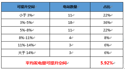 從50座典型電站的發(fā)電量提升空間分析表中可以看出:50座電站中只有11個電站發(fā)電量提升空間小于3%,有6個電站發(fā)電量提升空間大于11%,有29座電站也就是多一半的電站發(fā)電量提升空間在3%~8%之間,50座電站的平均發(fā)電量提升空間為5.92%,可見發(fā)電量提升空間非常的巨大。