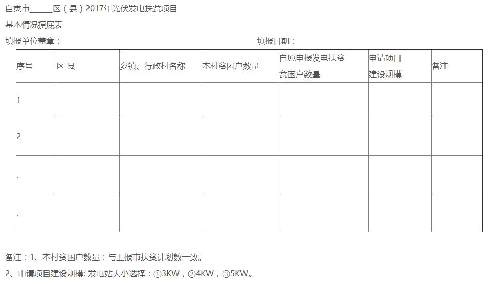 為做好全市光伏發(fā)電扶貧工作,按照《自貢市光伏發(fā)電扶貧工作實施意見》(自發(fā)改發(fā)〔2017〕373號)文件的要求,現(xiàn)就做好2017年光伏扶貧電站項目建設(shè)摸底和項目申報工作有關(guān)事項通知如下: