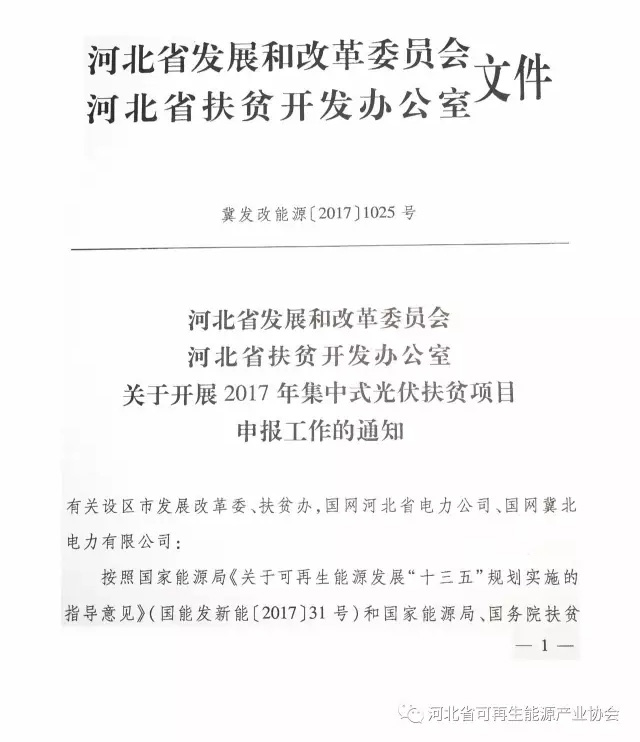 近日,河北省發(fā)改委及扶貧辦聯(lián)合下發(fā)《關(guān)于開展2017年集中式光伏扶貧項(xiàng)目申報(bào)工作的通知》(下簡(jiǎn)稱“通知”),通知規(guī)定:集中式光伏扶貧電站可按每30千瓦對(duì)應(yīng)一戶,保障每戶每年不少于3000元收入,期限為20年,光伏扶貧規(guī)模達(dá)100萬千瓦。原文如下: