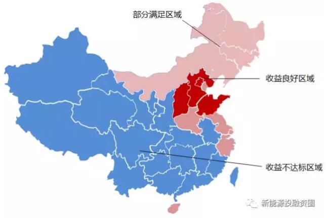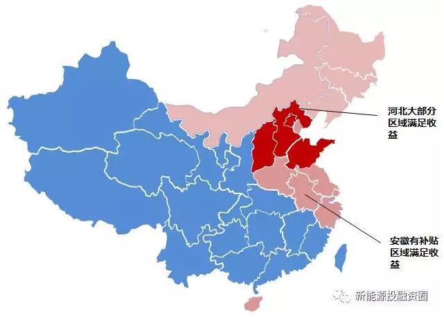 通過查詢各省大工業(yè)用電及商業(yè)用電可以看出,津京冀、山東、浙江、江蘇、上海、安徽、河南、湖南、廣東、海南等電價(jià)相對較高,都是比較適合做自發(fā)自用、余電上網(wǎng)類項(xiàng)目的,收益地圖見下圖。