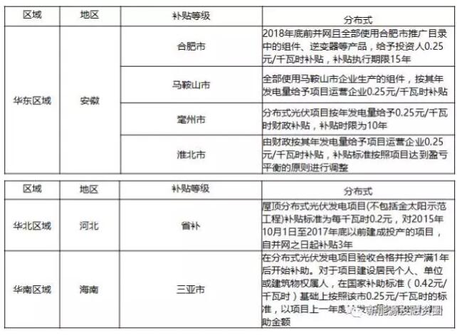 通過查詢?nèi)珖惺∈锌h光伏補(bǔ)貼政策,并加上補(bǔ)貼測算收益率,可以看出部分省市縣加上補(bǔ)貼可以滿足全額上網(wǎng)類項(xiàng)目投資收益率。加上補(bǔ)貼政策滿足收益率的補(bǔ)貼政策見下表。