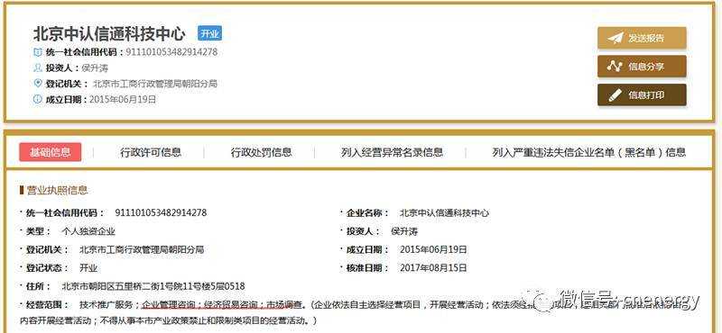 在“國(guó)家企業(yè)信用信息公示系統(tǒng)”的查詢結(jié)果中,北京中認(rèn)信通科技中心成立于2015年6月19日,并于今年8月15日剛剛通過(guò)了年度核準(zhǔn),注冊(cè)地址顯示為“北京市朝陽(yáng)區(qū)五里橋二街1號(hào)院11號(hào)樓5層0518”,其經(jīng)營(yíng)范圍包括技術(shù)推廣服務(wù)、企業(yè)管理咨詢、經(jīng)濟(jì)貿(mào)易咨詢和市場(chǎng)調(diào)查。