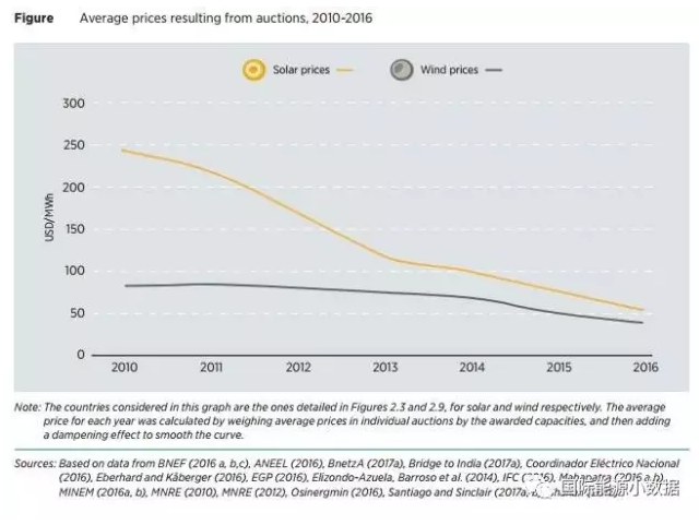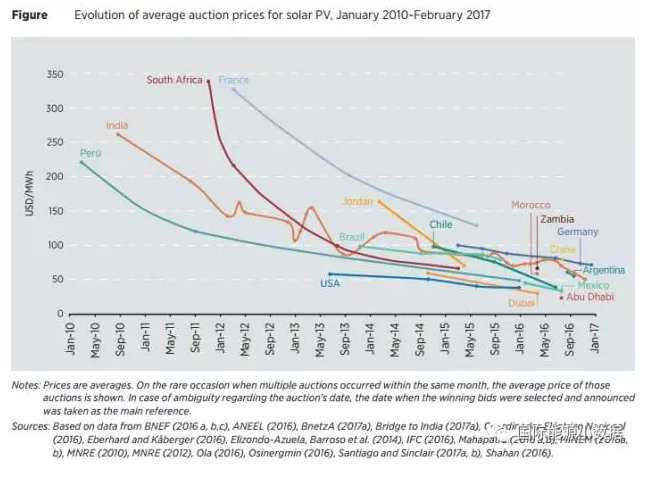 根據(jù)國際可再生能源署最新發(fā)布的《可再生能源競價分析報告》,到2016年中已經(jīng)至少有67個國家以競價方式確定可再生能源項目,而2010年時只有10個國家實行可再生能源項目競價。相比固定的標桿價格,可再生能源競價有效地降低了可再生能源上網(wǎng)的價格。2010年,風電合同平均價格為80美元/兆瓦時、光伏為250美元/兆瓦時;而2016年風電平均合同價下降37.5%,為40美元/兆瓦時,光伏下降幅度更達到80%,為50美元/兆瓦時(相當于人民幣0.33元/千瓦時)。