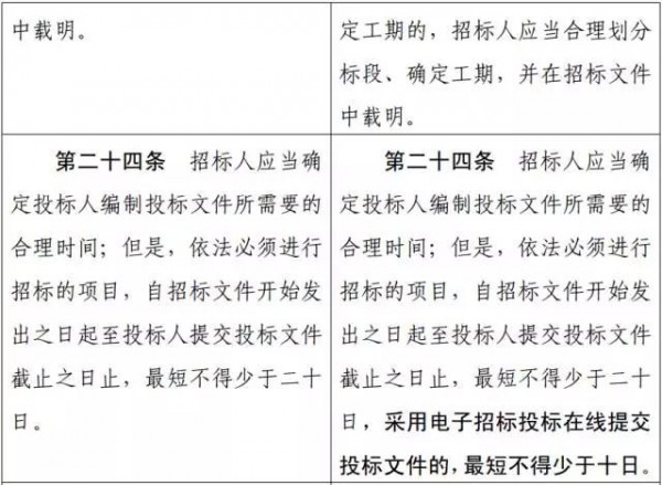 將第二十四條修改為:“招標(biāo)人應(yīng)當(dāng)確定投標(biāo)人編制投標(biāo) 文件所需要的合理時(shí)間;但是,依法必須進(jìn)行招標(biāo)的項(xiàng)目,自招標(biāo) 文件開(kāi)始發(fā)出之日起至投標(biāo)人提交投標(biāo)文件截止之日止,最短不得 少于二十日,采用電子招標(biāo)投標(biāo)在線(xiàn)提交投標(biāo)文件的,最短不得少 于十日。”