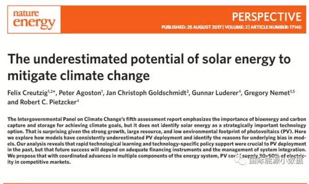 德國墨卡托研究所(Mercator Research Institute)的研究人員在最近一期《自然˙能源》雜志上發(fā)表題為The underestimated potential of solar energy to mitigate climate change(太陽能減緩氣候