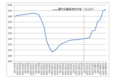 圖1 2017年1月-2017年8月國內(nèi)多晶硅現(xiàn)貨價格 來源:硅業(yè)分會