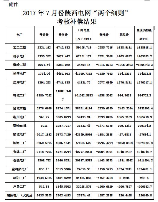 2017年7月份陜西電網(wǎng)“兩個細則”考核補償情況的通知
