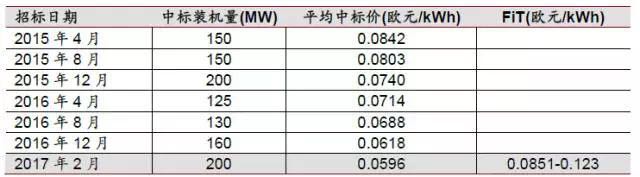 競(jìng)價(jià)上網(wǎng)制度為政府通過招標(biāo)的方式,確定最低中標(biāo)價(jià)為項(xiàng)目的上網(wǎng)電價(jià),且該電價(jià)保持若干年不變。德國2014年進(jìn)行大型地面光伏電站項(xiàng)目的招標(biāo)試點(diǎn),2015年開始對(duì)100kw以上的項(xiàng)目實(shí)施招標(biāo)制,目前對(duì)規(guī)模在750kW-10MW之間的光伏項(xiàng)目實(shí)施競(jìng)價(jià)上網(wǎng)制度,從下表可以看出德國競(jìng)價(jià)上網(wǎng)中標(biāo)價(jià)比FiT的上限低接近60%,目前該上網(wǎng)電價(jià)已經(jīng)在德國煤電上網(wǎng)電價(jià)區(qū)間內(nèi)。