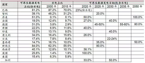 可再生能源將是大勢(shì)所趨:隨著全球氣候的變暖以及能源形勢(shì)的嚴(yán)峻,全球越來越多的國家倡導(dǎo)可再生能源的發(fā)展和使用,大部分國家都為可再生能源發(fā)電占比進(jìn)行中長期的規(guī)劃,部分國家已經(jīng)提前完成2020年的規(guī)劃(意大利、丹麥等),不少國家計(jì)劃到2050年的可再生能源發(fā)電(包含水電)占比要達(dá)到50%以上。