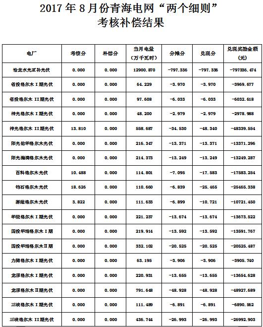 附件:2017年8月份青海電網(wǎng)“兩個細則”考核補償結果