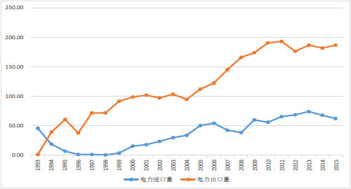 1993-2015年中國(guó)電力進(jìn)出口情況(單位:億kWh)