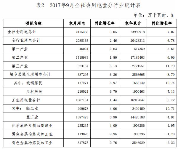 (一)全社會用電量情況。2017年9月,全省全社會用電量247.55億千瓦時,同比增長3.05%;累計用電量2398.99億千瓦時,同比增長7.07%。
