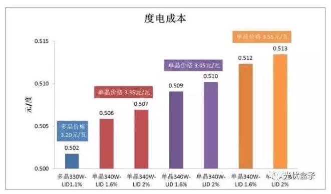 當(dāng)單晶的初始光衰為2%,單晶組件價格必須低于多晶0.01元/瓦,任何超出以上價差范圍(-0.01元~+0.02元/瓦)的單晶組件,將導(dǎo)致單晶光伏電站系統(tǒng)的度電成本高出多晶光伏電站系統(tǒng),降低了太陽能電站的投資回報率。