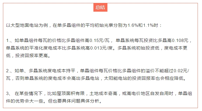 1、如果單晶組件每瓦的價格比多晶組件高0.15元/瓦, 單晶系統(tǒng)投資就比多晶高0.108元/瓦,單晶系統(tǒng)平準(zhǔn)化度電成本比多晶系統(tǒng)高0.004元/度。