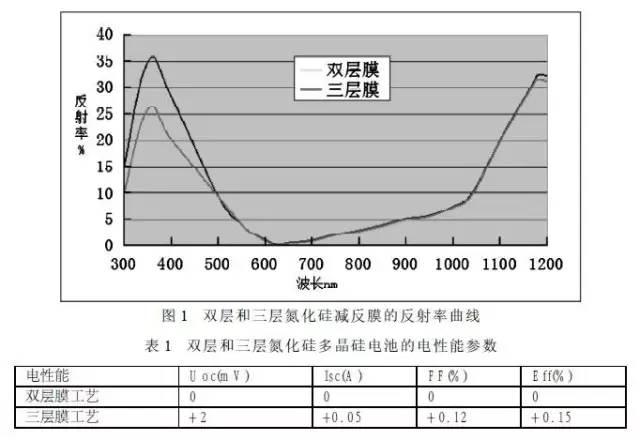將雙層和三層氮化硅膜所做的太陽電池分別進(jìn)行電性能測(cè)試,結(jié)果見表1。從表1中看出,三層膜的太陽電池的開路電壓比雙層膜的提高2mV,另外三層膜太陽電池的短路電流也比雙層膜的提高了0.05A。分析原因開路電壓的提高應(yīng)該與三層氮化硅膜的少子壽命高于雙層膜,鈍化效果較好有關(guān);而短路電流的提升主要是由于三層膜的實(shí)驗(yàn)片短波部分反射率較雙層膜的低,從而增加了光的吸收,所以短路電流略有提高。開路電壓與短路電流的提升,最終使三層氮化硅膜多晶太陽電池比傳統(tǒng)雙層膜的光電轉(zhuǎn)換效率提高了0.15%。