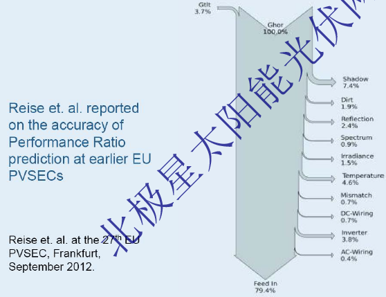IEA給出的對于PR效率鏈損失的估計(jì)預(yù)測:遮擋損失:7.4%;積塵:1.9%;反射:2.4%;光譜:0.9%;輻射量:1.5%;溫度:4.6%;失配:0.7%;DC線損:0.7%;逆變器:3.8%;AC線損:0.4%.