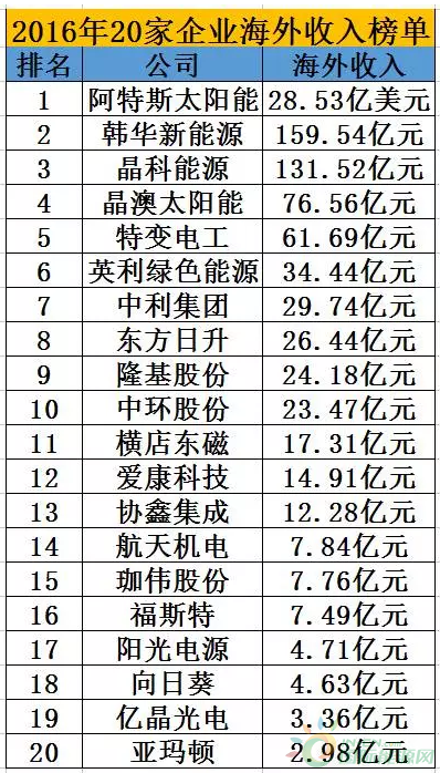 光頭君對此根據(jù)企業(yè)財報,梳理了20家光伏企業(yè)2016年在海外市場的收入,以饗讀者。