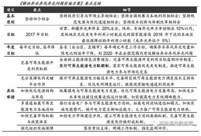 《解決棄水棄風(fēng)棄光問題實(shí)施方案》發(fā)布。2017年11月13日,國家能源局、國家發(fā)改委正式下發(fā)《解決棄水棄風(fēng)棄光問題實(shí)施方案》(以下簡稱《方案》),明確按年度實(shí)施可再生能源電力配額制,并在2020年全國范圍內(nèi)有效解決棄水棄風(fēng)棄光問題。方案共13頁,內(nèi)容達(dá)27條之多,解決“三棄”(棄水棄風(fēng)棄光)問題的難度可見一斑。我們認(rèn)為《方案》主要有以下三個亮點(diǎn):(1)制定了2017年的目標(biāo),并提出各地要逐年下調(diào)目標(biāo),以在2020年全國范圍內(nèi)有效解決“三棄”問題;(2)明確按年度實(shí)施可再生能源電力配額制,并明確了配額的考核主體;(3)再次重申解決“三棄”問題的重要性。