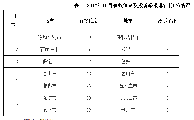 各地市(區(qū))按照收到的有效信息數(shù)量排序,呼和浩特市、石家莊市、保定市、唐山市和邯鄲市、廊坊市和滄州市列轄區(qū)內(nèi)前5位;按照投訴舉報(bào)數(shù)量排序,呼和浩特市、邯鄲市、包頭市、唐山市和石家莊市、張家口市和滄州市排在轄區(qū)內(nèi)前5位。(2017年10月有效信息及投訴舉報(bào)排名前5位情況見表三)