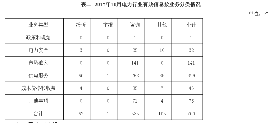 投訴舉報(bào)主要集中在電力行業(yè),共68件。從業(yè)務(wù)分類情況看,供電服務(wù)方面61件,占89.71%;電力安全3件,占4.41%;成本價(jià)格和收費(fèi)4件,占5.88%。(2017年10月電力行業(yè)有效信息按業(yè)務(wù)分類情況見表二)