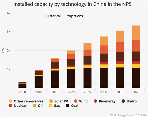 到2040年,預(yù)計(jì)中國將增加的發(fā)電量相當(dāng)于整個(gè)美國電力系統(tǒng)的發(fā)電量。國際能源機(jī)構(gòu)預(yù)計(jì),根據(jù)目前的政策,中國的煤炭消費(fèi)量在未來幾年將達(dá)到高峰,到2040年將下降15%。中國的電動(dòng)車投資也將占全球的40%以上。