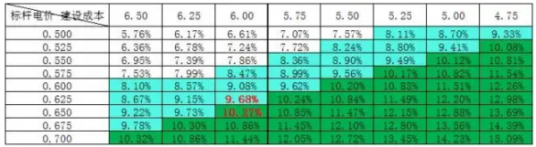 表二:二類地區(qū)標(biāo)桿電價VS建設(shè)成本VS全投資項(xiàng)目收益率