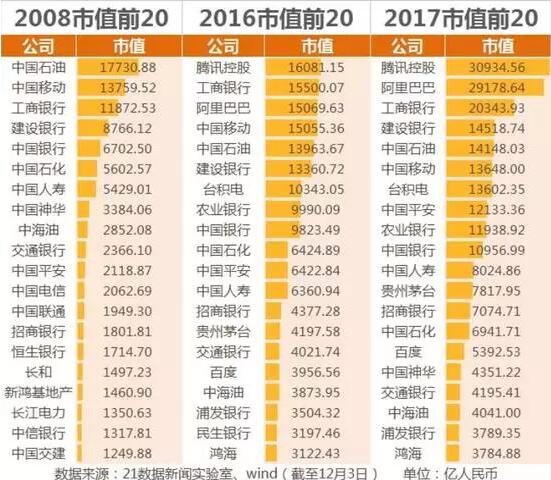 值得一提的是,這也是十年來首次,互聯(lián)網(wǎng)科技公司包攬前兩名。而在2008年至2014年,中國石油一直雄踞市值榜首,占據(jù)第二名的基本是工商銀行;2015年則由工商銀行、中國移動領(lǐng)先。