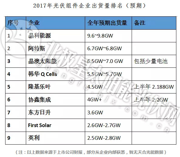 預測 | 2017年TOP級光伏組件企業(yè)出貨量排名