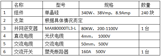 方案1,系統(tǒng)采用72片340Wp光伏組,20串12并共240塊組成,總功率 81.6KWp。采用1臺80KW光伏逆變器,接入380V線,送入光伏并網(wǎng)接入配電箱,再接入10kV柱上變壓器380V母線端。