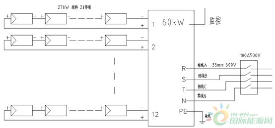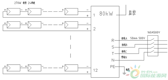 方案2,系統(tǒng)采用60片280Wp光伏組件,24串12并共288塊組成,總功率 80.64KWp。采用1臺80KW光伏逆變器,接入380V線,送入光伏并網(wǎng)接入配電箱,再接入10kV柱上變壓器380V母線端。