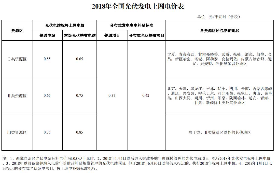 12月22日,國家發(fā)改委發(fā)布《2018年光伏發(fā)電項目價格政策的通知》,2018年1月1日之后投運的光伏電站,一類、二類、三類資源區(qū)標(biāo)桿電價分別由2017年的0 65元、0 75元和0 85元降低為每千瓦時0 55元、0 65元和0 75元