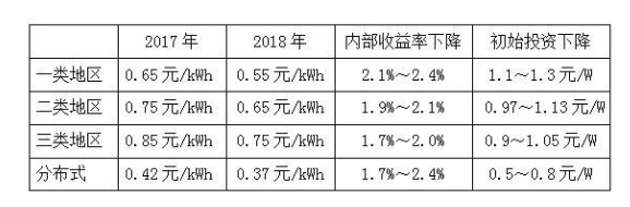 國家發(fā)展改革委于2017年12月22號下發(fā)《關(guān)于2018年光伏發(fā)電項目價格政策的通知》,要求降低2018年1月1日之后投運的光伏電站標(biāo)桿上網(wǎng)電價,Ⅰ類、Ⅱ類、Ⅲ類資源區(qū)標(biāo)桿上網(wǎng)電價分別調(diào)整為每千瓦時0.55元、0.65元、0.75元(含稅);村級光伏扶貧電站上網(wǎng)電價分別為0.65元、0.75元、0.85元;通知規(guī)定,2018年1月1日以后投運的、采用“自發(fā)自用、余量上網(wǎng)”模式的分布式光伏發(fā)電項目,全電量度電補貼標(biāo)準(zhǔn)降低0.05元,即補貼標(biāo)準(zhǔn)調(diào)整為每千瓦時0.37元(含稅)。采用“全額上網(wǎng)”模式的分布式光伏發(fā)電項目按所在資源區(qū)光伏電站價格執(zhí)行。