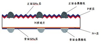 和常規(guī)單晶電池工藝相比,PERC單晶電池主要增加了背面鈍化、背面SiNx膜沉積和激光打孔三道工藝。其中激光打孔工藝是利用一定脈沖寬度的激光在去除部分覆蓋在電池背面的鈍化層和SiNx覆蓋層,以使絲網(wǎng)印刷的鋁漿可以與電池背面的硅片形成有效接觸,從而使光生電流可以通過Al層導出。因Al漿無法穿透SiNx層,其余未被激光去除的鈍化層被覆蓋在其上方的SiNx覆蓋層保護,發(fā)揮降低表面復合速率,提升效率的作用。