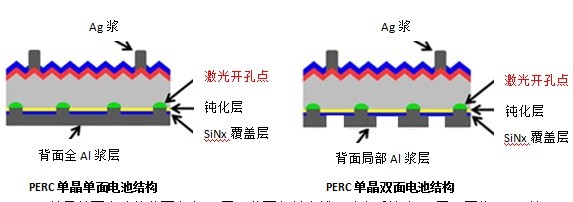 PERC單晶單面電池的背面為全Al層,背面入射光線無法穿透該全Al層,因此PERC單晶單面電池只有正面可以吸收入射光進行光電轉(zhuǎn)換。為了使PERC電池均有雙面光電轉(zhuǎn)換功能,行業(yè)改變了PERC電池的印刷工藝,將背面全Al層印刷工藝修改為背面局部Al層印刷工藝。該工藝是盡量保證背面Al漿印刷在激光開孔點處,以使光生電流仍然可以通過激光開孔點的Al層導出。