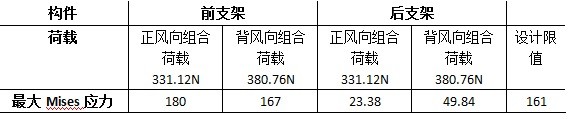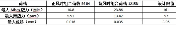 最終得到兩組數(shù)值,工況1 正風(fēng)組合荷載:F=1321N 工況2 背風(fēng)組合荷載:F=-1520N