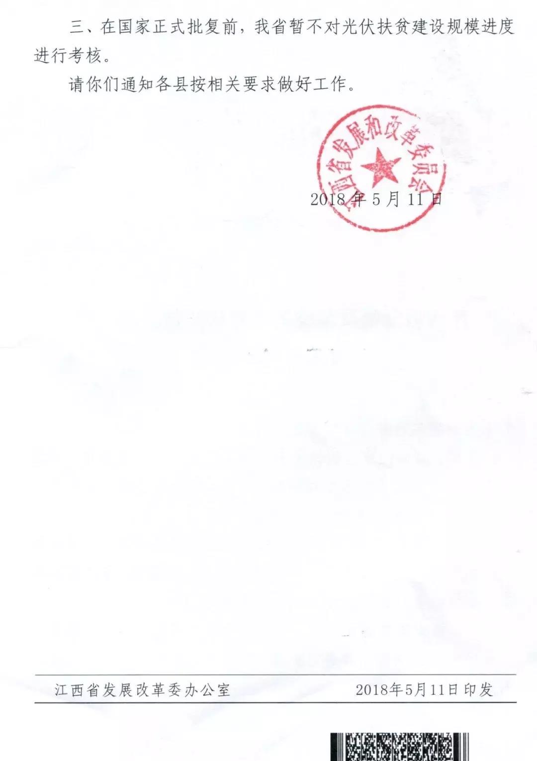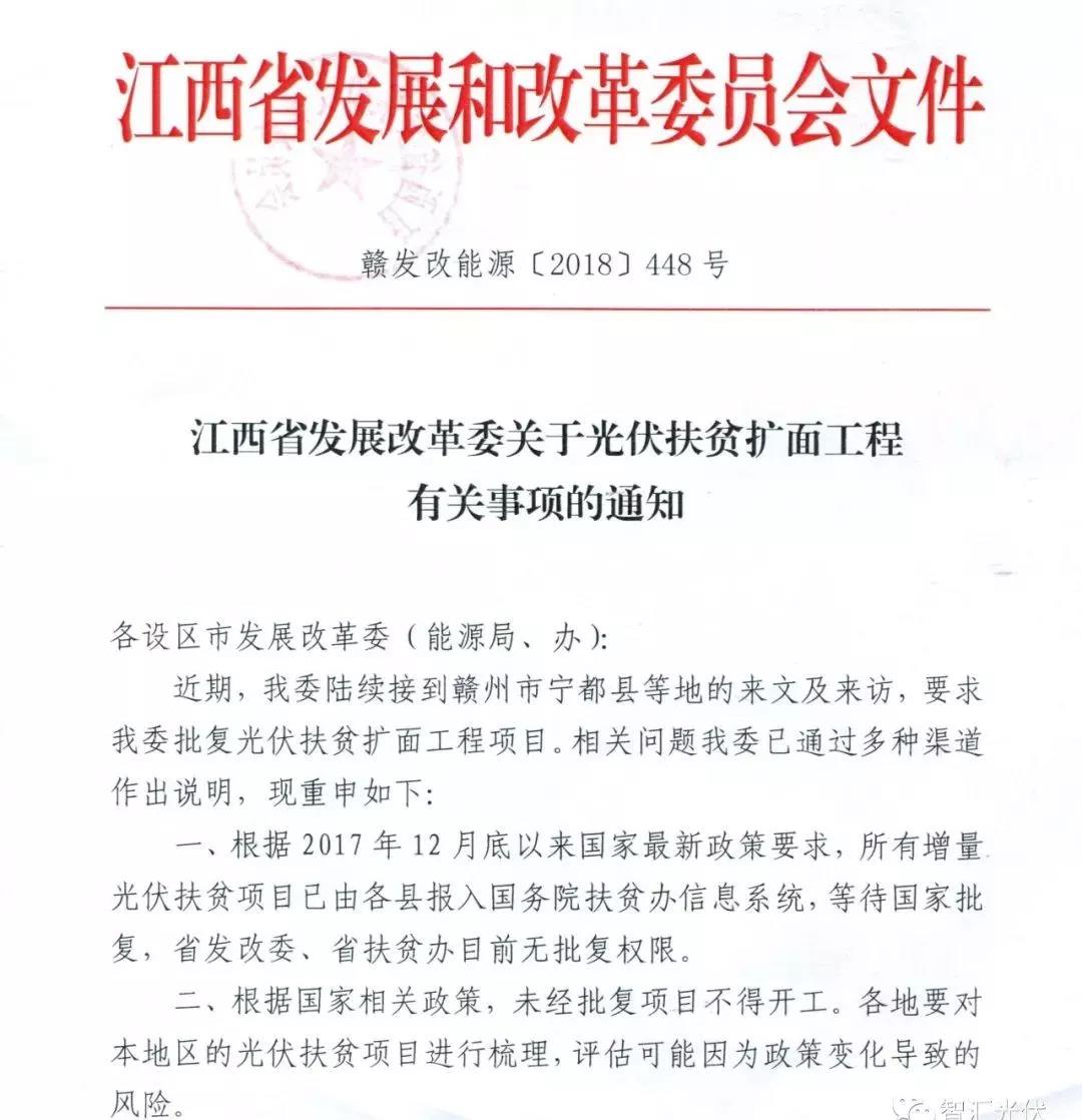 2018年5月11日,江西省發(fā)改委下發(fā)《關(guān)于光伏扶貧擴(kuò)面工程有關(guān)事項(xiàng)的通知》規(guī)定,所有增量光伏扶貧項(xiàng)目已由各縣級(jí)報(bào)入國務(wù)院扶貧辦信息系統(tǒng),等待國家批復(fù),省發(fā)改委、省扶貧辦目前無批復(fù)權(quán)限,未經(jīng)批復(fù)不得開工。