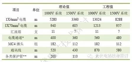根據(jù)以上的分析結(jié)論:1500V系統(tǒng)效率提高的主因是電纜用量減少,使得損耗降低。而兩種系統(tǒng)其工程量究竟工程量的變化在哪里?針對(duì)前文中的模型進(jìn)行分析,計(jì)算兩類系統(tǒng)的工程量變化如下: