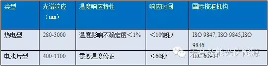 一般來(lái)說(shuō),熱電型總輻射表主要用來(lái)測(cè)量水平面太陽(yáng)總輻射,也可用來(lái)測(cè)量入射到方陣斜面上的太陽(yáng)總輻射,因此在評(píng)價(jià)電站的PR能效比和EPI一般采用熱電表來(lái)計(jì)量方陣斜面總輻射量(POA),而由于光電表的光譜響應(yīng)和電池的光譜響應(yīng)較為接近,所以光伏組件或方陣的實(shí)時(shí)輸出功率測(cè)試可使用光電表。