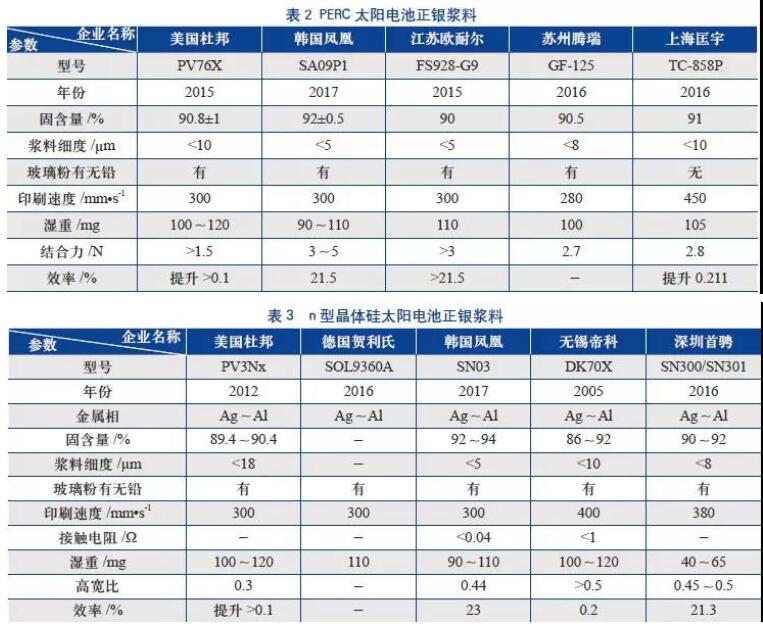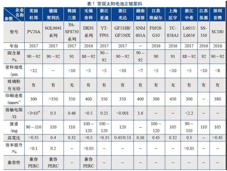 導(dǎo)電銀漿的品質(zhì)對(duì)太陽電池的電性能起著決定性作用,優(yōu)質(zhì)的導(dǎo)電銀漿是制造高效太陽電池的關(guān)鍵。雖然目前國內(nèi)企業(yè)生產(chǎn)的漿料市場占有率較低,但在國內(nèi)漿料生產(chǎn)商的努力下,國產(chǎn)漿料與進(jìn)口漿料的性能差距已經(jīng)較小,主要是穩(wěn)定性與品牌知名度還亟需提高。表1~表5列舉了國內(nèi)外漿料商為不同結(jié)構(gòu)太陽電池設(shè)計(jì)的最新正銀漿料的性能參數(shù)[20]。